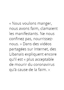 Dans le journal Animal Politico, un vendeur de rues mexicain de 77 ans témoigne : « Évidemment, le coronavirus me fait peur. Mais au fond j’ai plus peur de mourir de faim. » L’Orient-Le Jour rapporte que des manifestations ont éclaté le 29 mars dans des quartiers pauvres de Beyrouth et de Tripoli en violation du couvre feu : « Nous voulons manger, nous avons faim, clamaient les manifestants. Ne nous confinez pas, nourrissez-nous. » Dans des vidéos partagées sur Internet, des Libanais expliquent encore qu’il est « plus acceptable de mourir du coronavirus qu’à cause de la faim. » Dans Wakat Séra, un éditorialiste burkinabé parle du nouveau virus foudroyant, le « Pochvid » ( »poches vides ») : « Covid-19 et Pochvid-20 se tiennent pour l’instant par la main, dans une solidarité inquiétante », explique-t-il ; mais le Pochvid-20 « risque de tuer plus vite que le Covid-19 ».